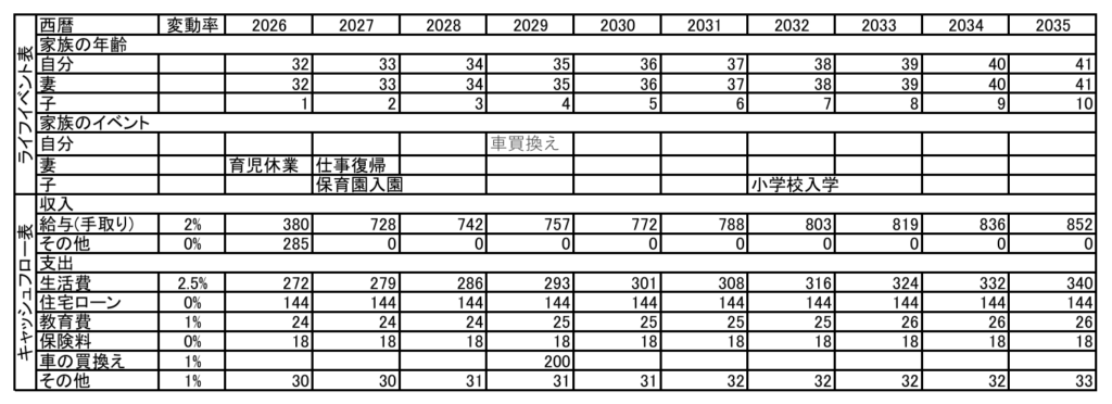 テキストを見ながら実際に作ってみました。一部数値はテキトウです。(単位は万円)